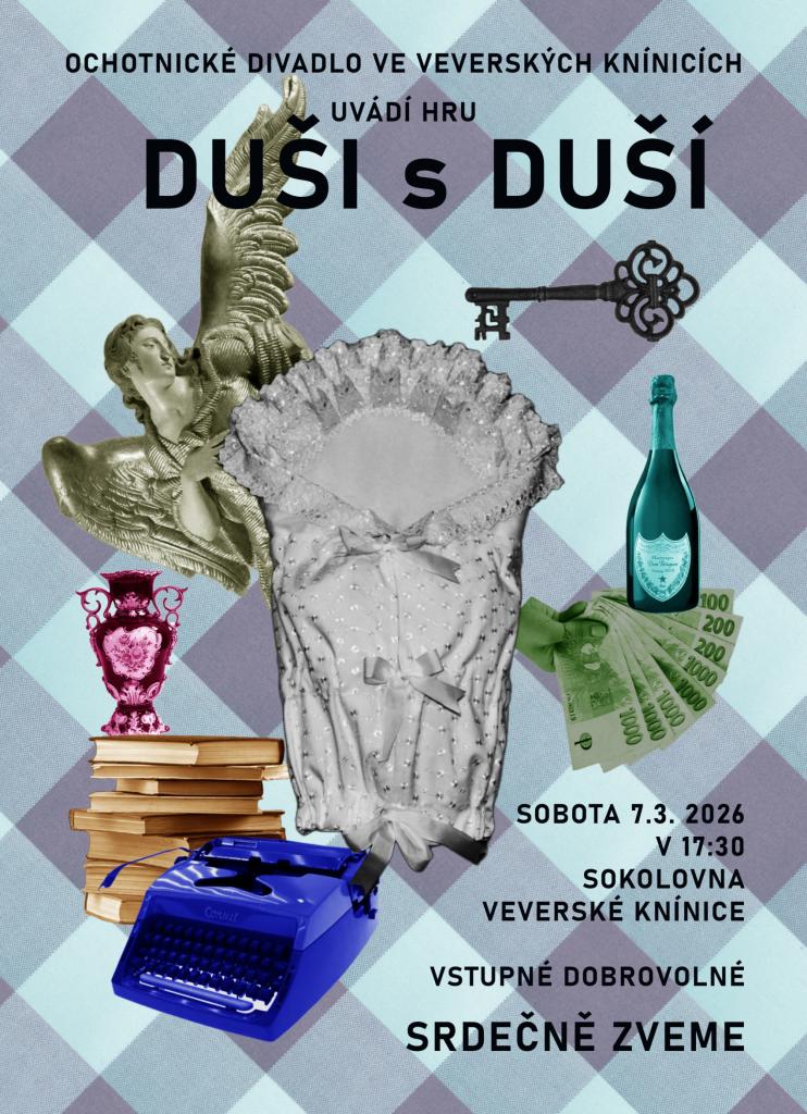 Ochotnické divadlo ve Veverkých Knínicích zve na představení hry DUSI S DUŠÍ, které se uskuteční v sobotu 7. března 2026 v 17:30 hodin v sokolovně. Neváhejte a přijďte podpořit místní divadelníky. Těšíme se na vaši účast a společně strávený příjemný večer. Vstupné je dobrovolné!