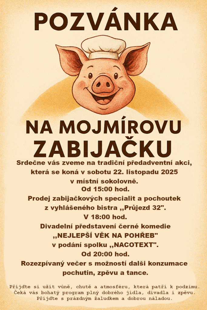 Přijďte si užít vůně, chutě a atmosféru, která patří k podzimu. Čeká vás bohatý program plný dobrého jídla, divadla i zpěvu...a přijďte s prázdným žaludkem a dobrou náladou.